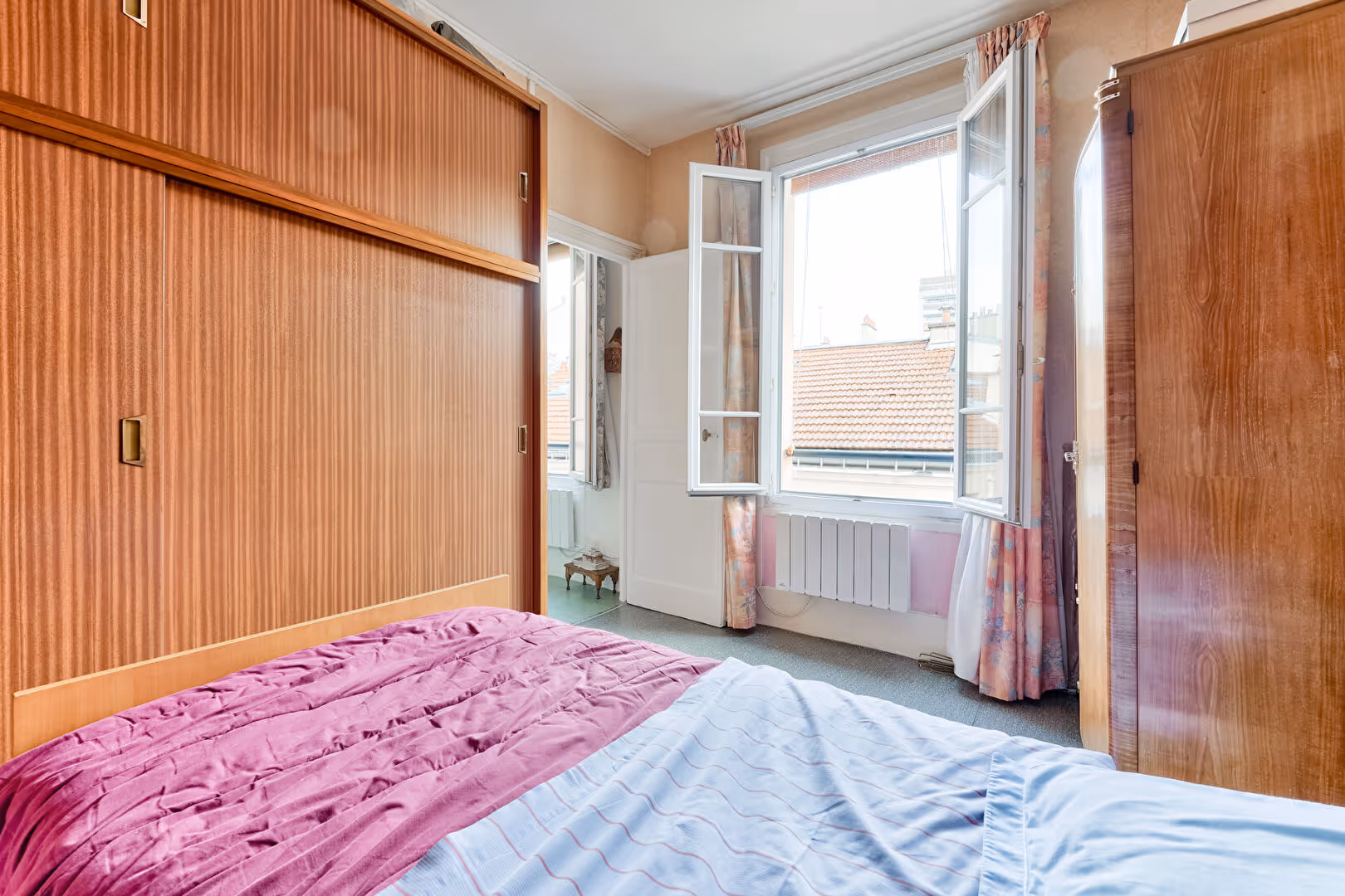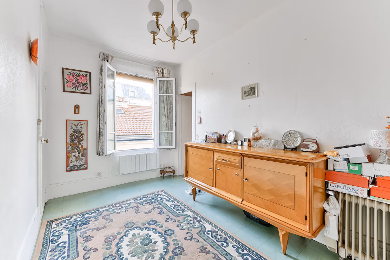 Bénéficiant d'une excellente luminosité, d'une hauteur sous plafond de 2,90 m et d'une vue dégagée sur les toits, l'appartement présente un plan optimal sans perte d'espace.