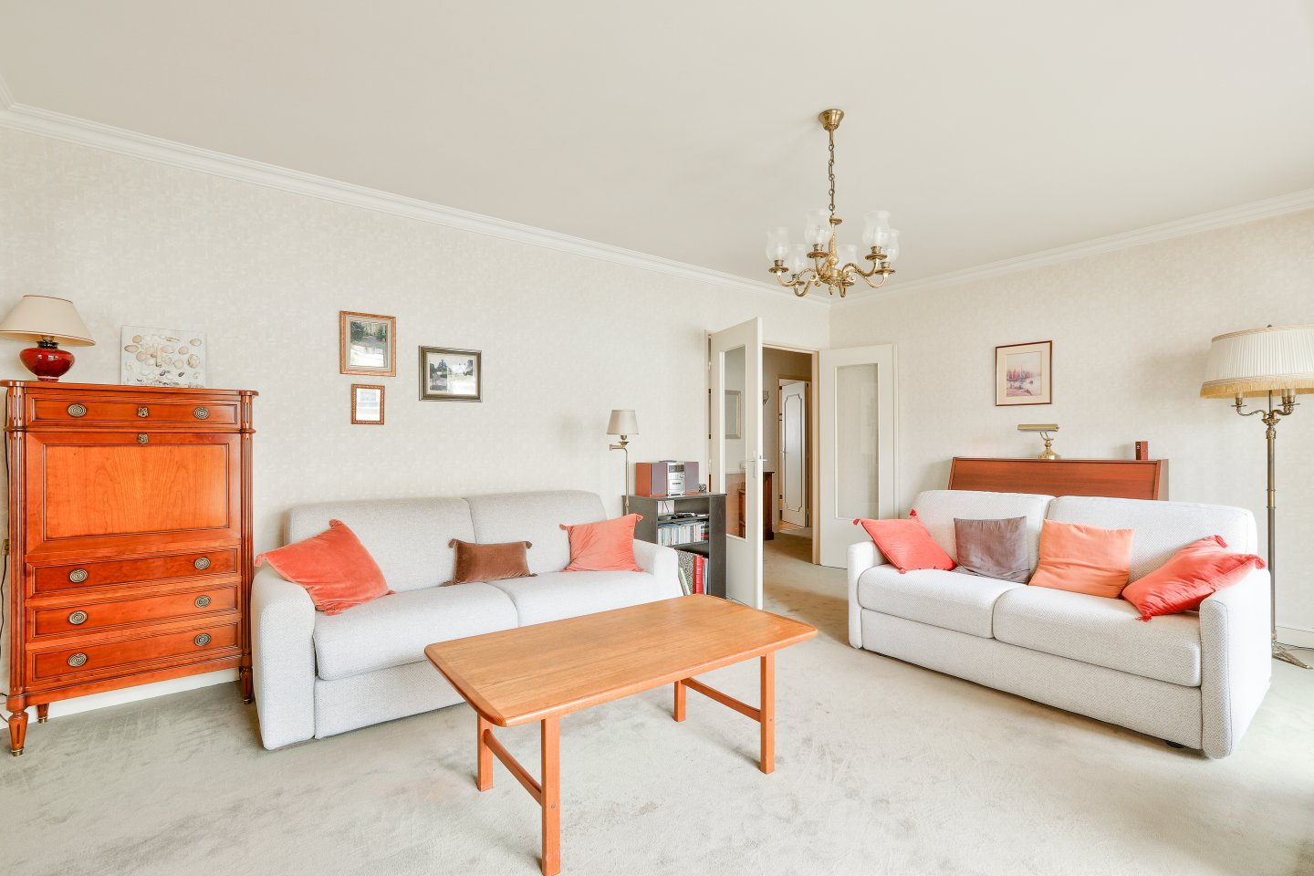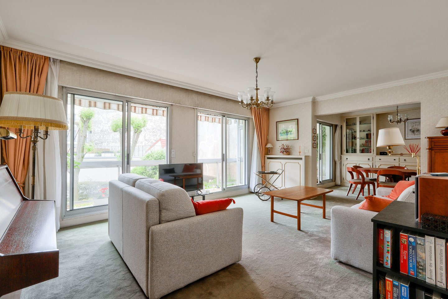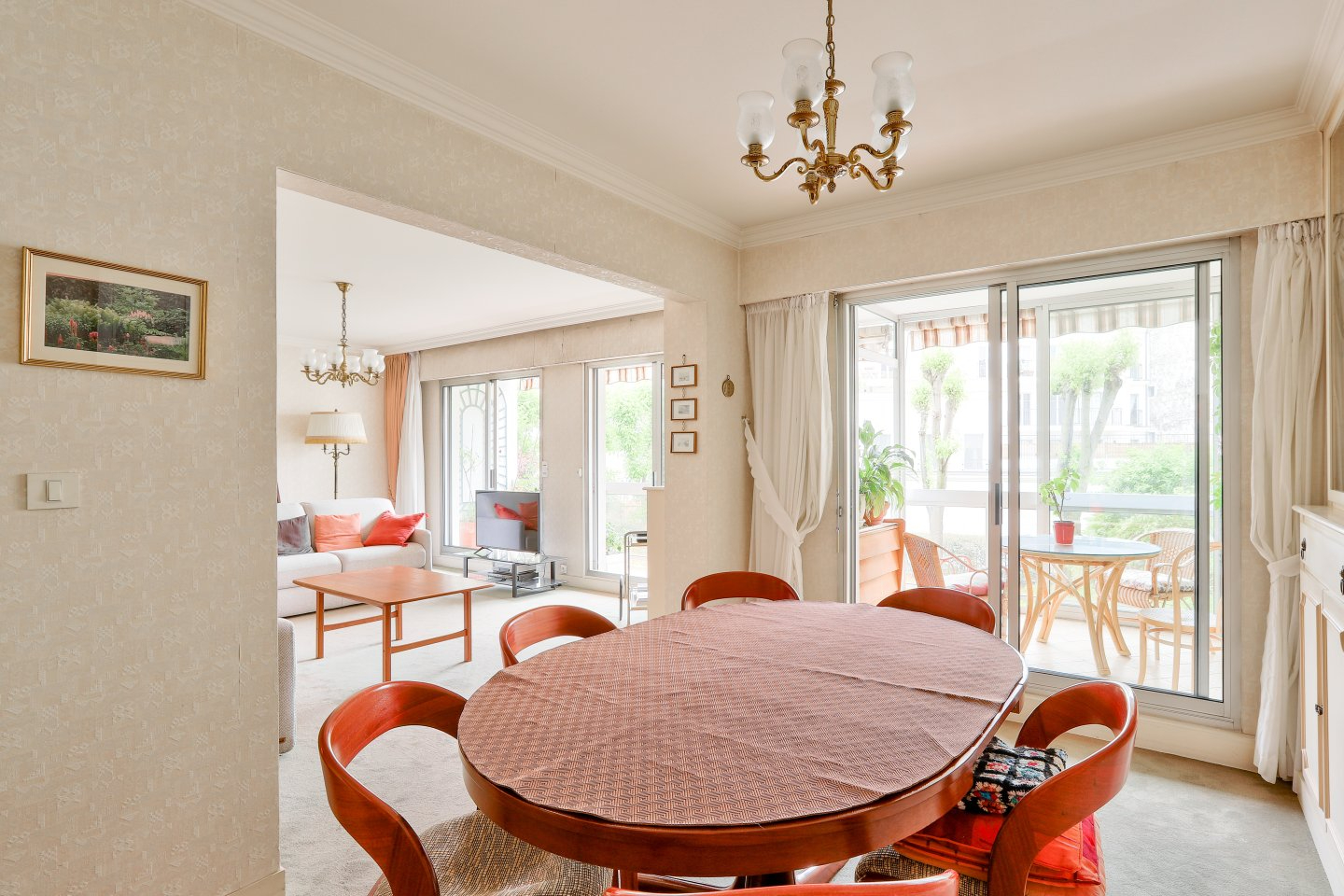 Traversant sud et nord, vues agréables sur jardin, lumineux, calme et parfaitement agencé, il comprend : entrée, cuisine aménagée dînatoire, séjour double sur balcon, salle à manger avec loggia de 6,56m², dégagement avec placards; 2 chambres dont une avec balcon (3ème chambre facilement réalisable en lieu et place de la salle à manger), salle de bains, salle d'eau et wc séparés. Double vitrage et volets roulants, chaudière gaz individuelle (eau chaude et chauffage). Vendu avec cave et box en sous-sol (2,5 m X 4,80 m). (4.71 % honoraires TTC à la charge de l'acquéreur.)