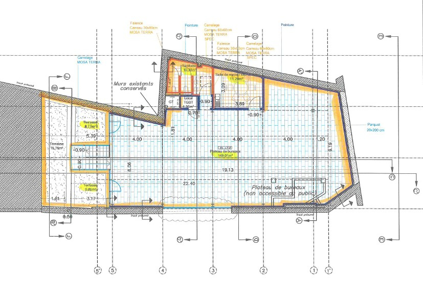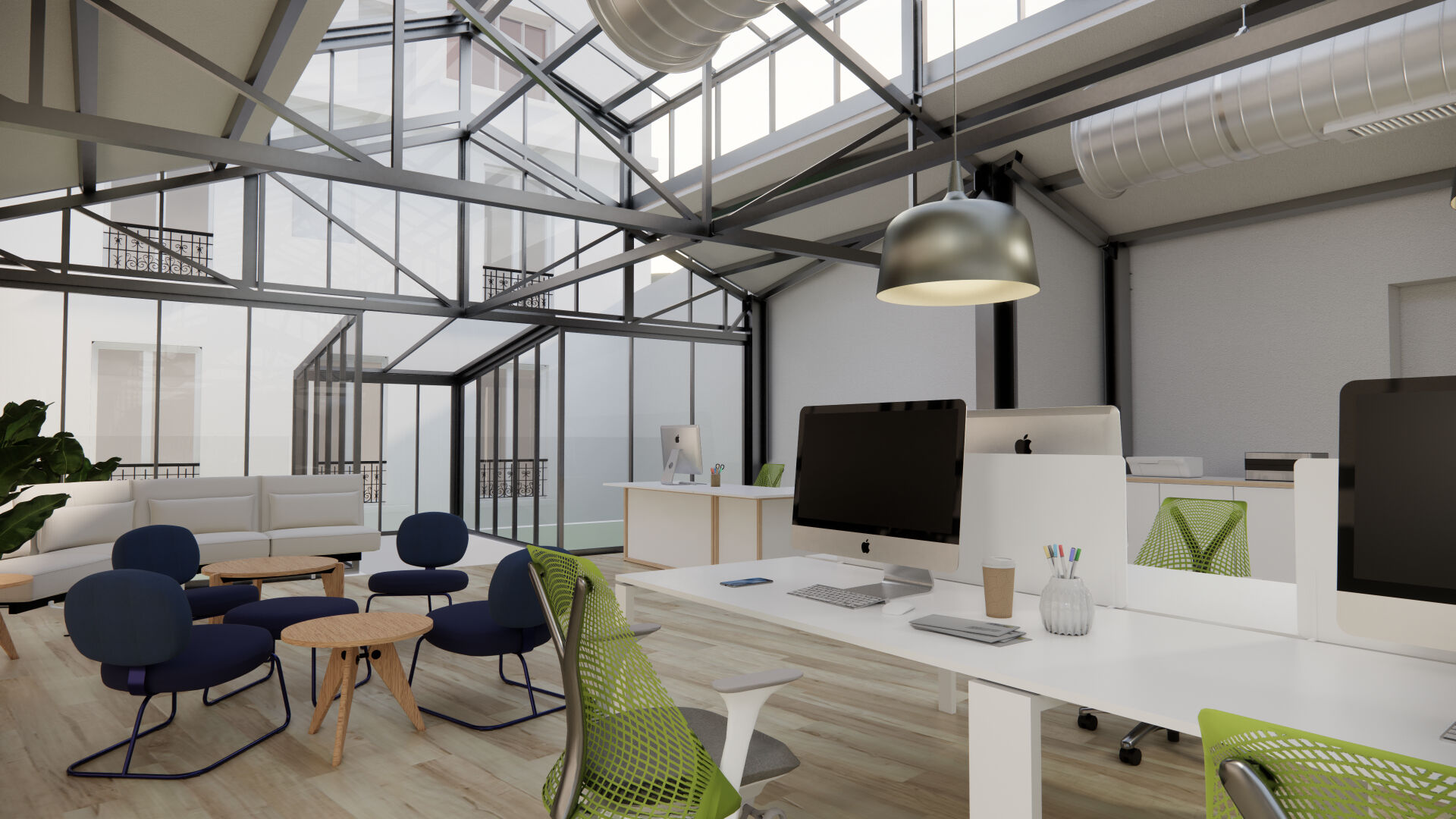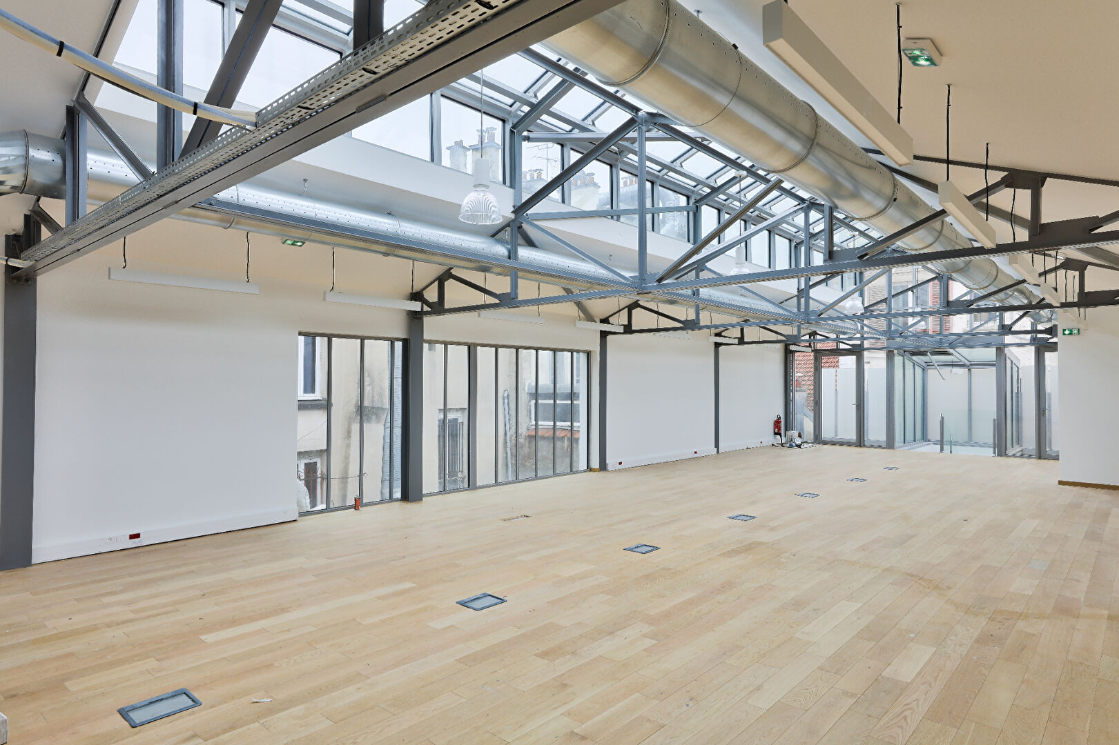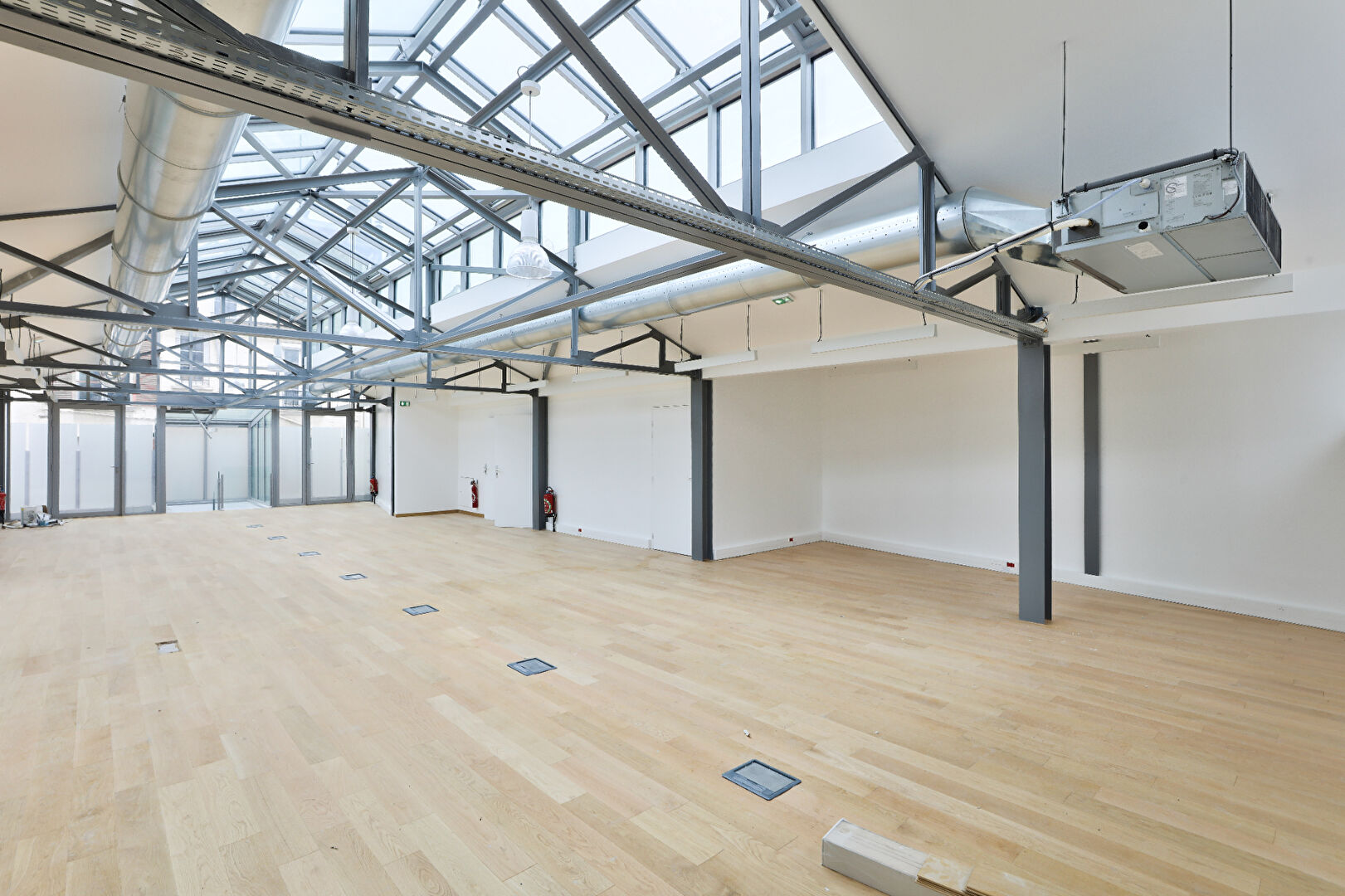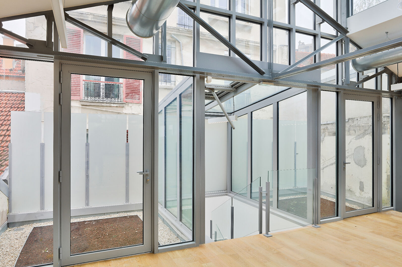 MONTREUIL, in the immediate vicinity of Vincennes, a 5-minute walk from the Croix de Chavaux metro station (line 9), in the pedestrian area of rue du Capitaine Dreyfus: On the first floor overlooking the courtyard (access from the street, in a quiet area) by stairs from a small building of character (stairs from a small building of character), office space under a brand new glass roof, decorated with two green terraces. Surface of 173.29 m². Parquet, reversible air conditioning, fiber. File and plans on request.